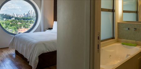 Com uma arquitetura arrojada, que reflete as curvas dos corredores do hotel, as acomodações presenteiam os hóspedes com vistas do Parque Ibirapuera ou da ampla área verde da região dos Jardins, que podem ser observadas através das janelas circulares. A confortável cama queen size e a decoração minimalista também são pontos altos da experiência.